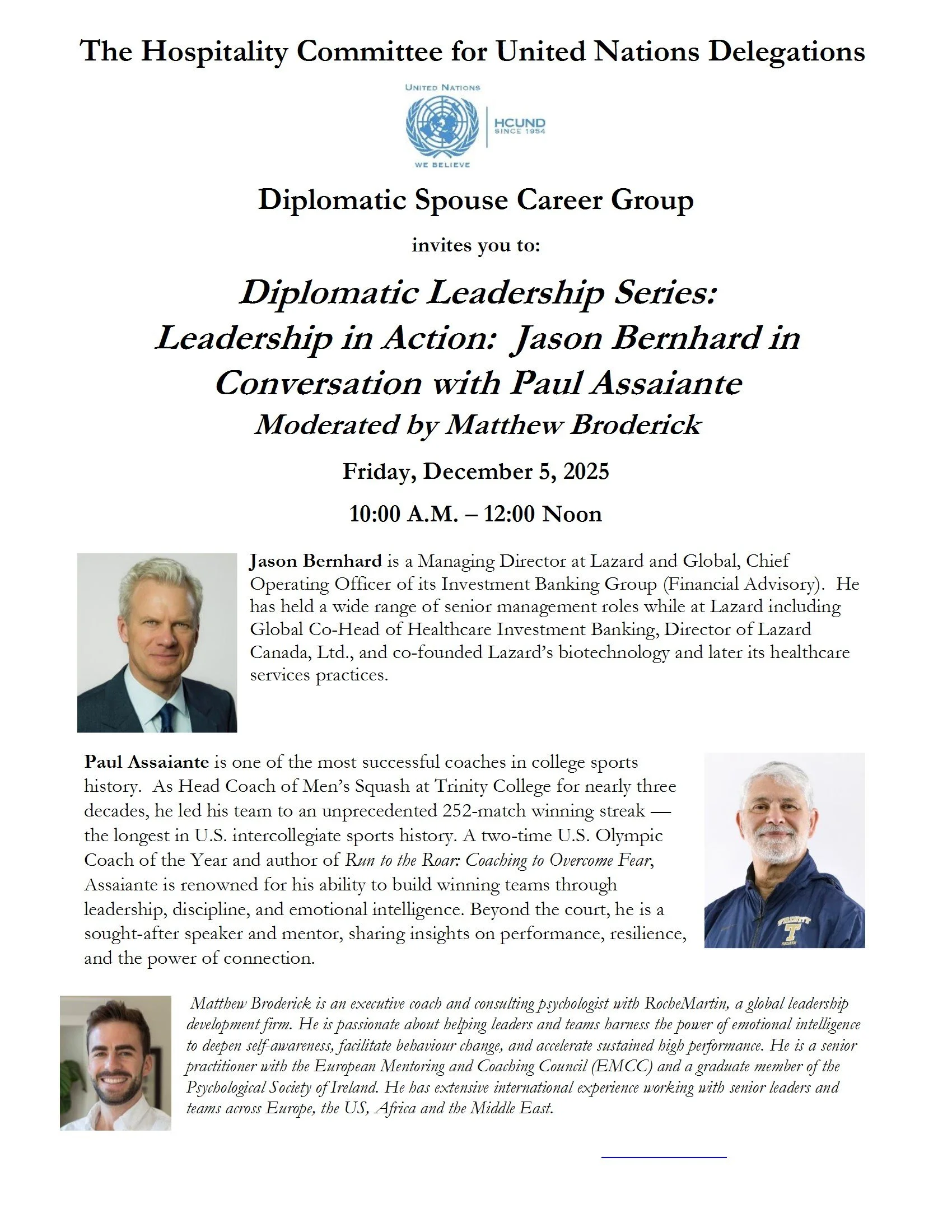 Diplomatic Spouse Career Group Diplomatic Leadership Series: Jason Bernhard in Conversation with Paul Assaiante, moderated by Matthew Broderick